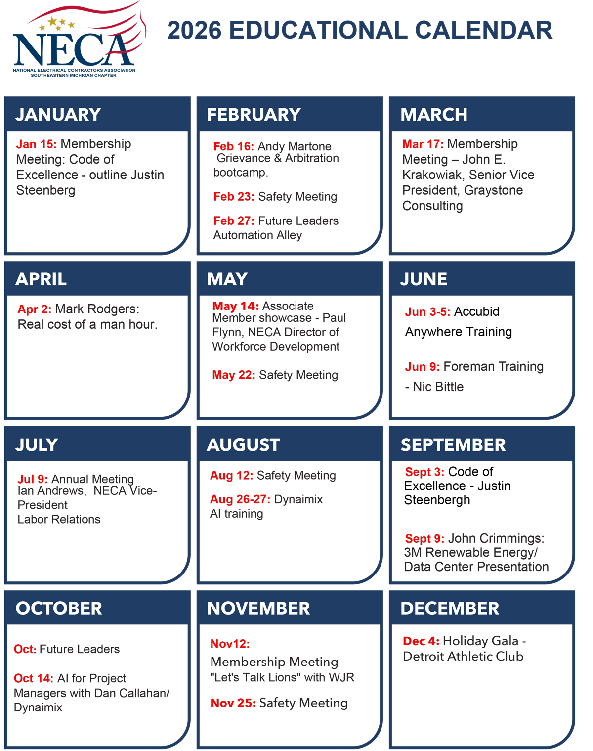 NECA provides a variety of educational opportunities for contractors throughout the year. We understand the value to education and talent development and strive to offer programming that meets the needs of our contractors in the ever-changing electrical industry.